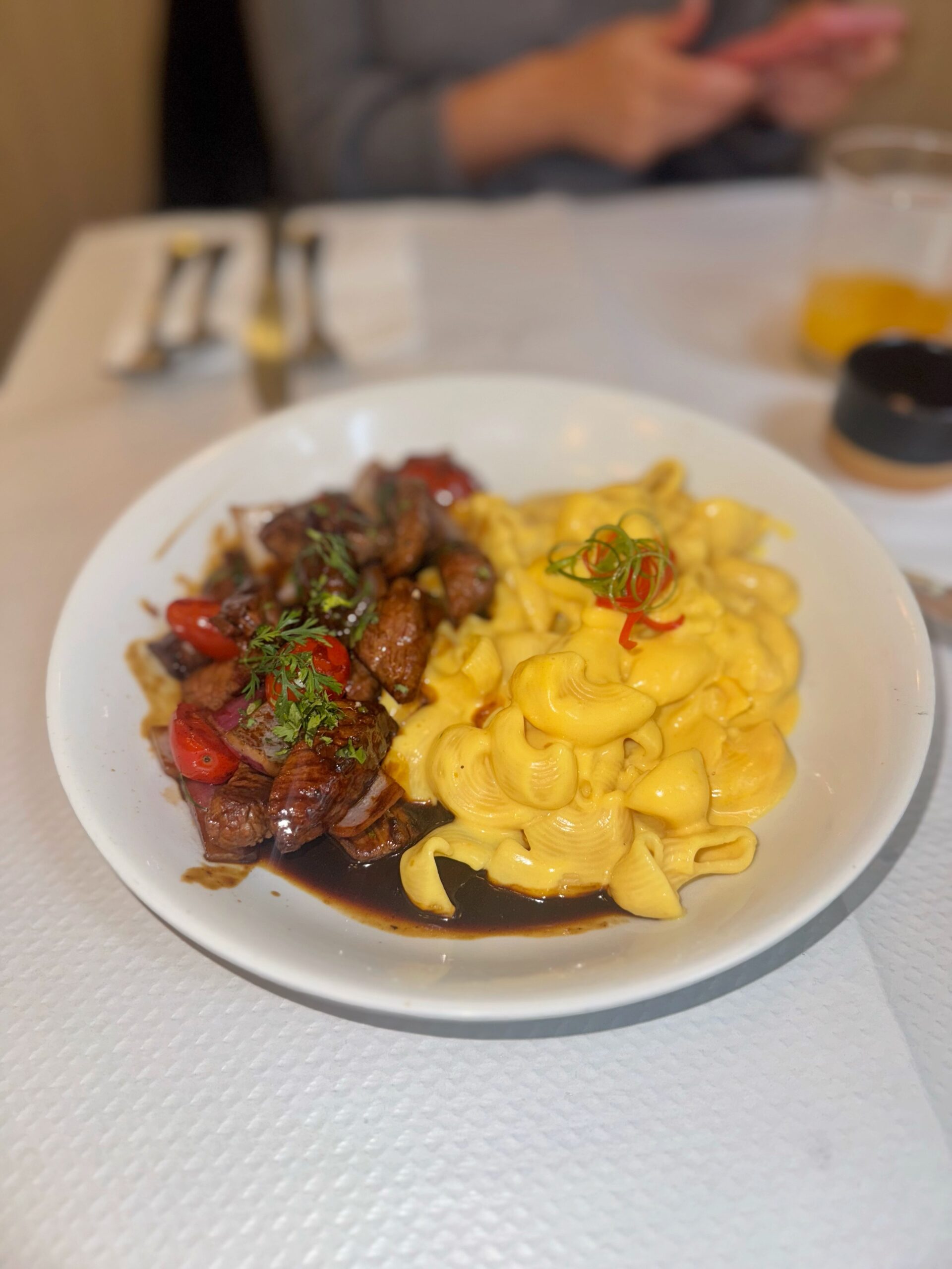 Conchiglie à la huancaína con lomo saltado